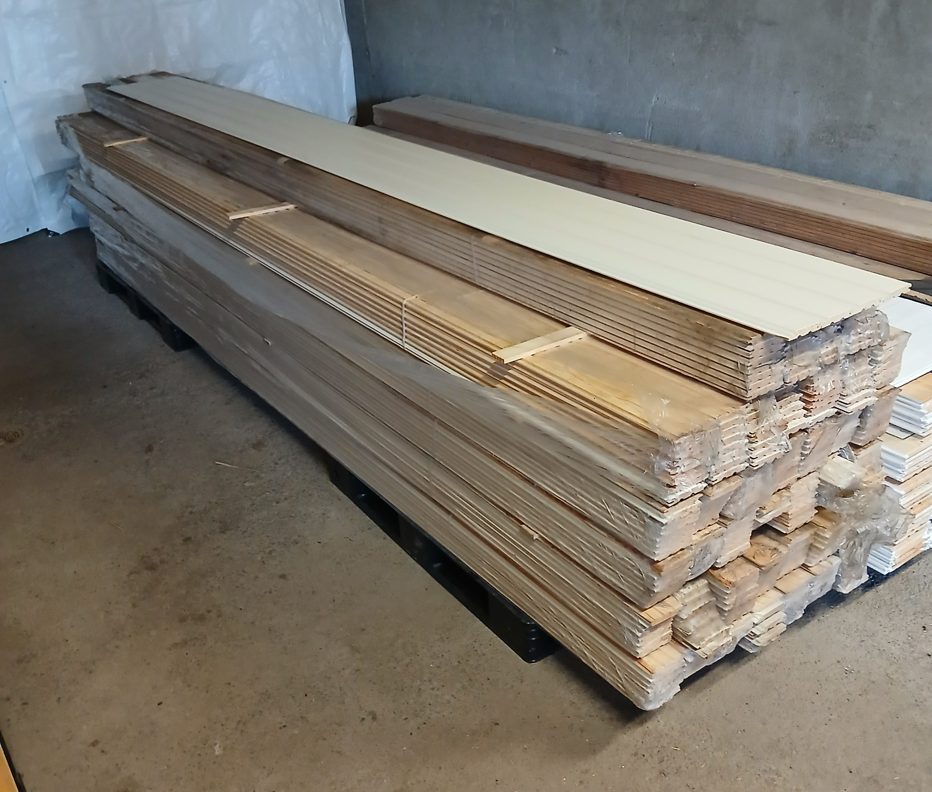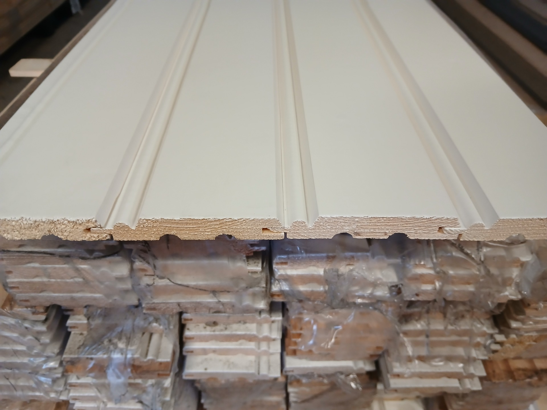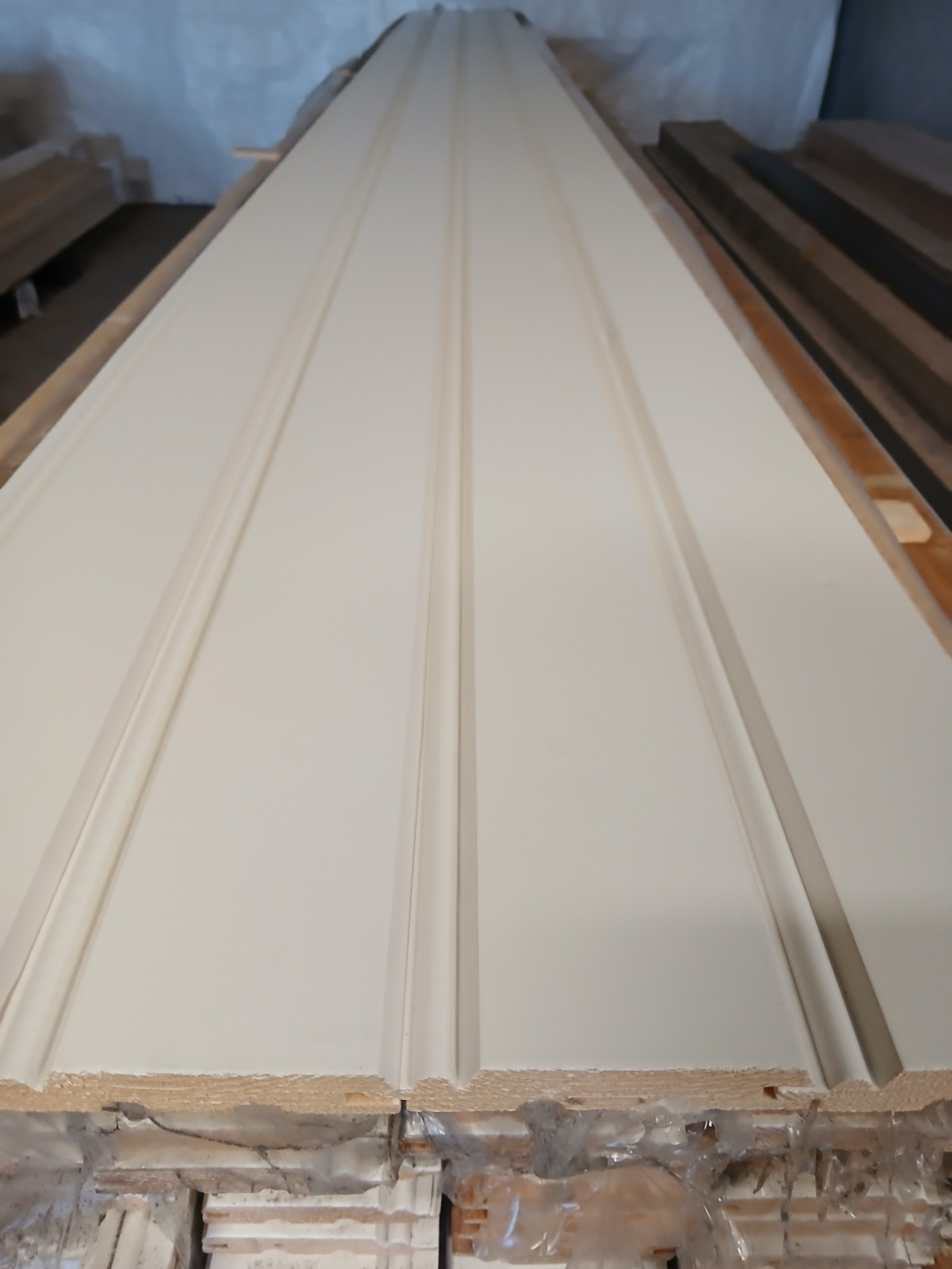 Valkoiseksi peittomaalattu helmipaneeli. Materiaali mänty.