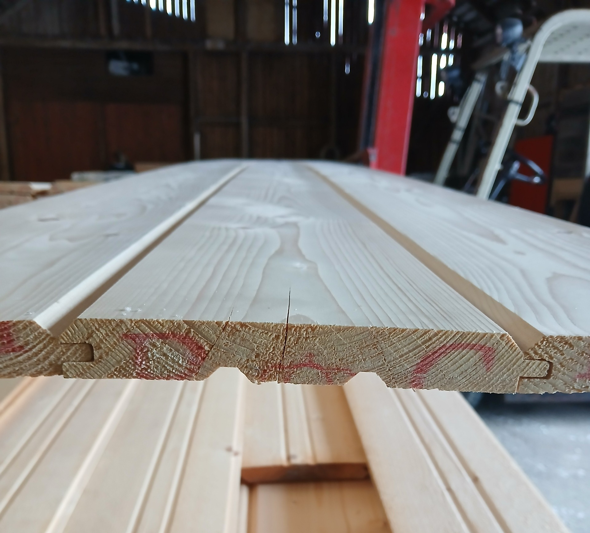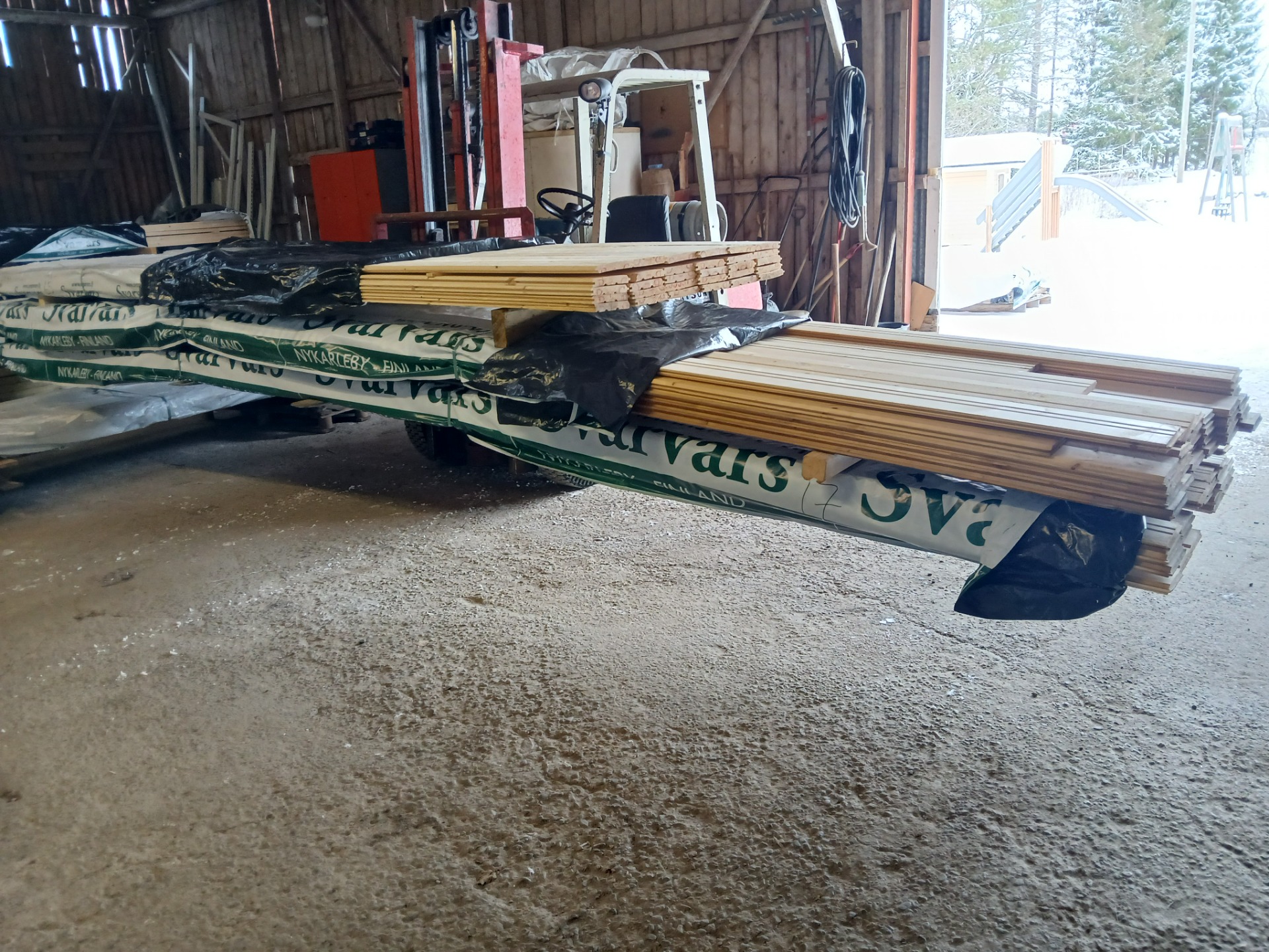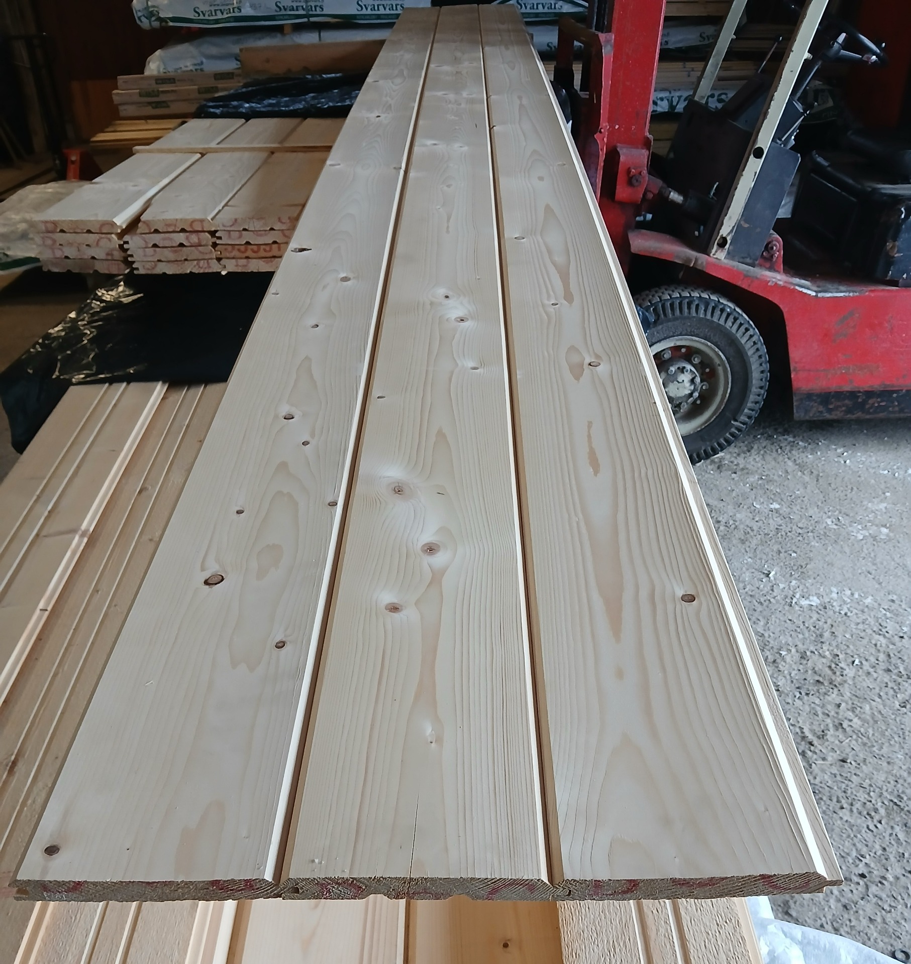 Leveää ja paksua hirsipaneelia, kuusimetriset paneelit päätypontattuja.