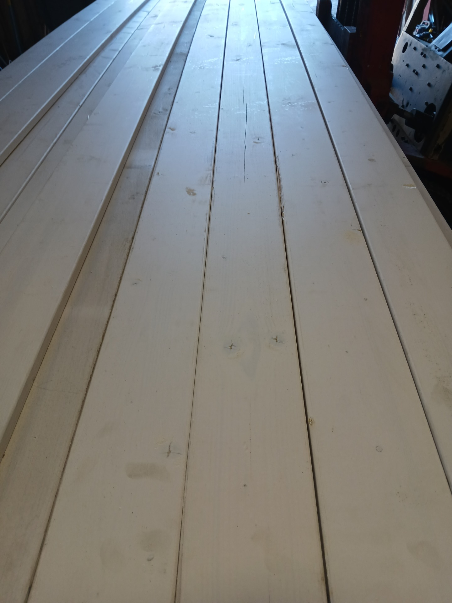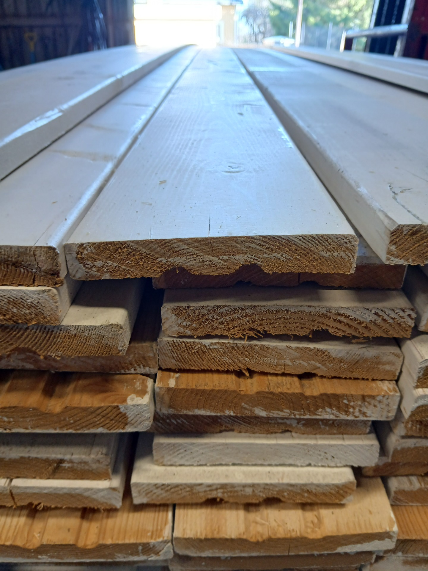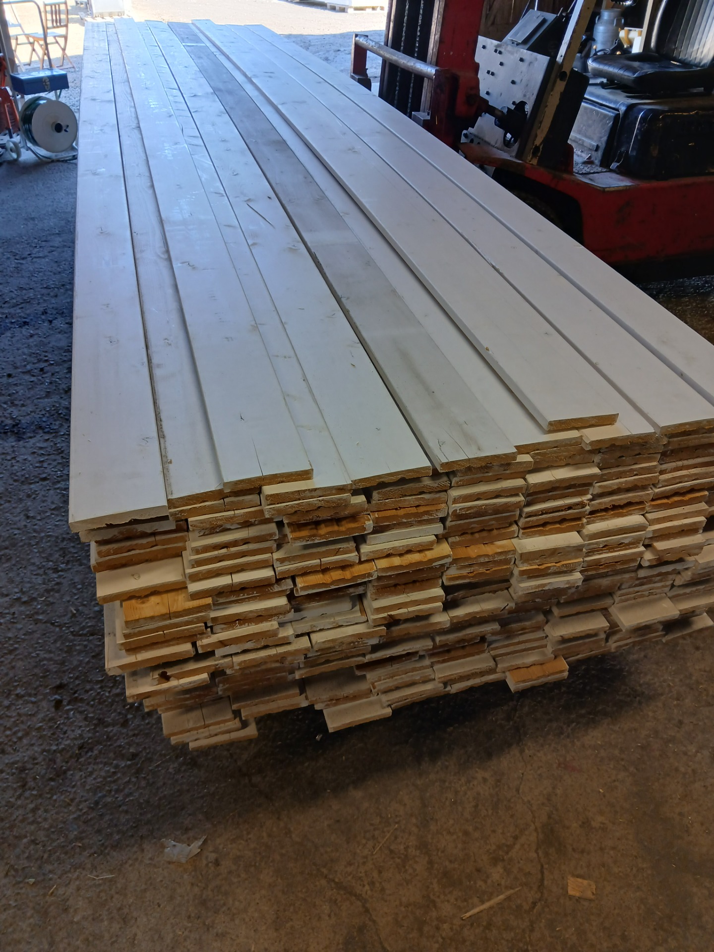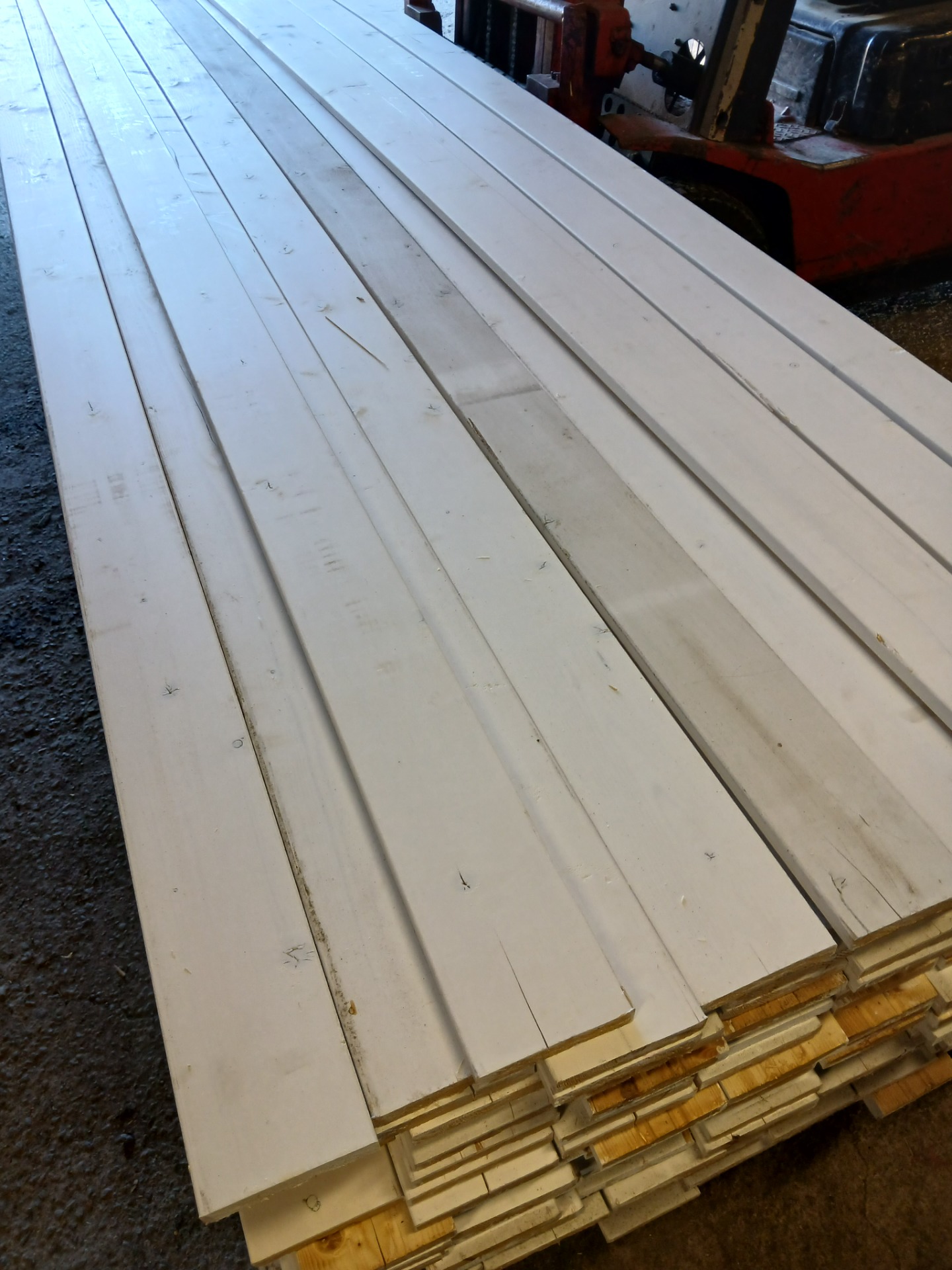 Höyläpintaista valkoiseksi maalattua lautaa. Sisä- ja ulkokäyttöön.
