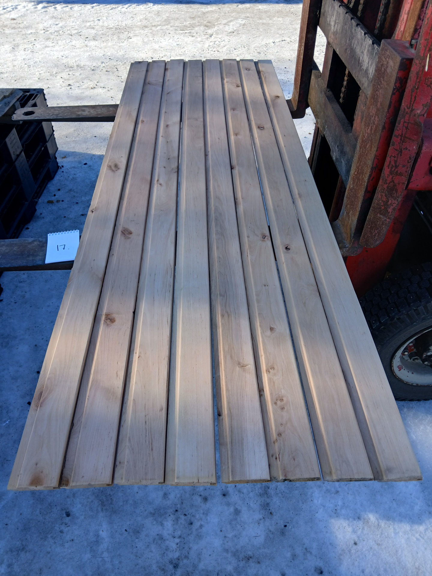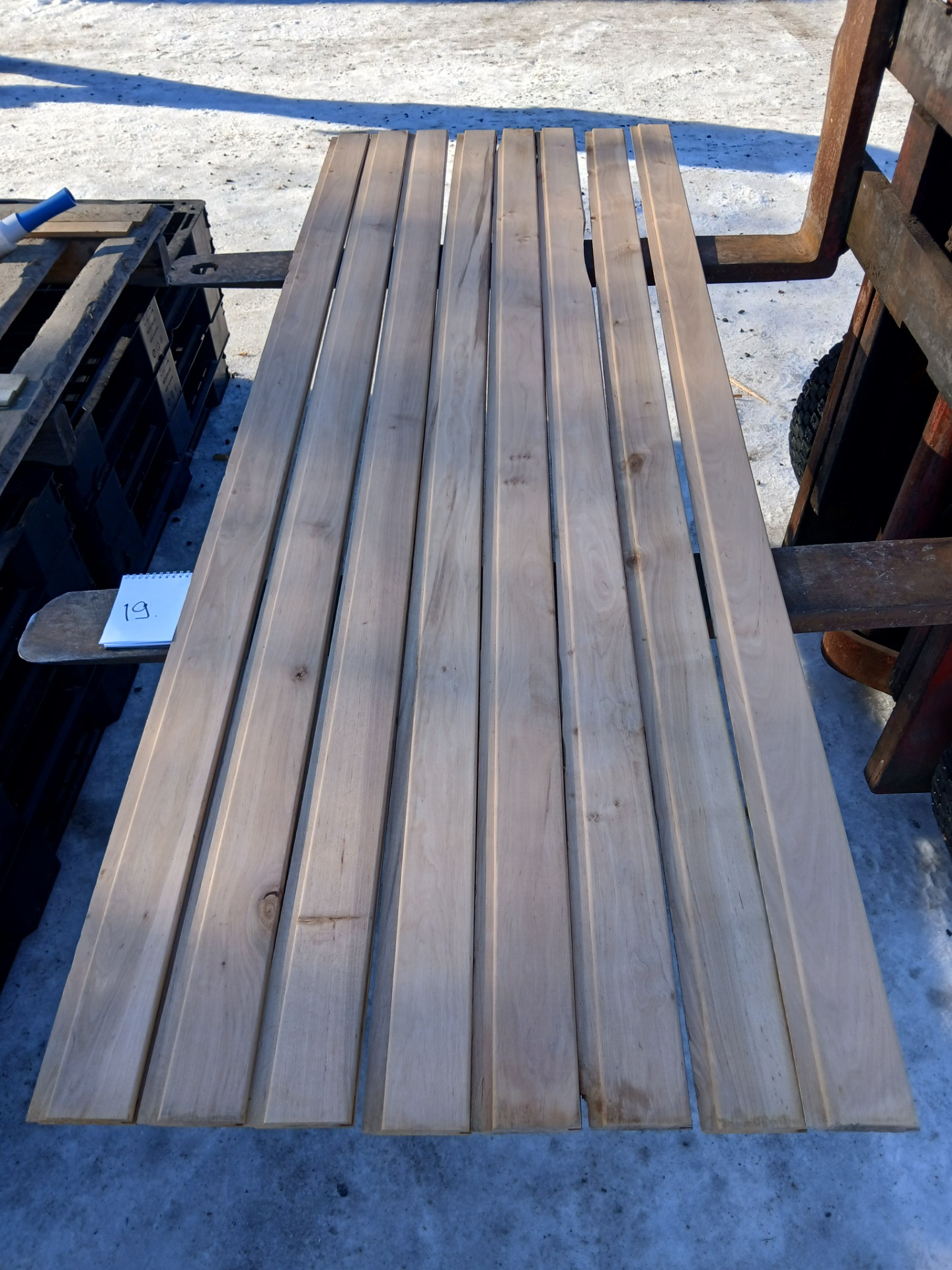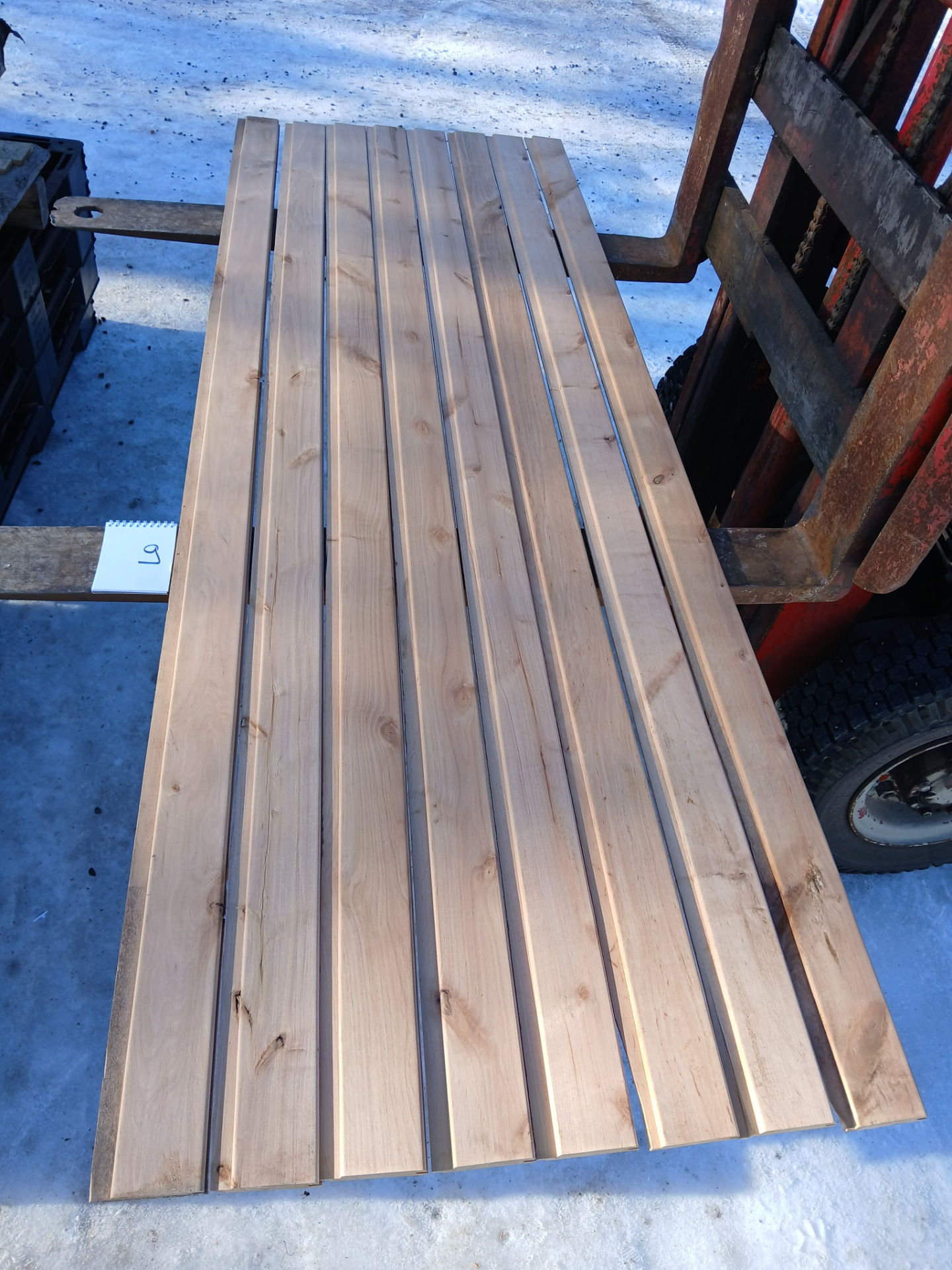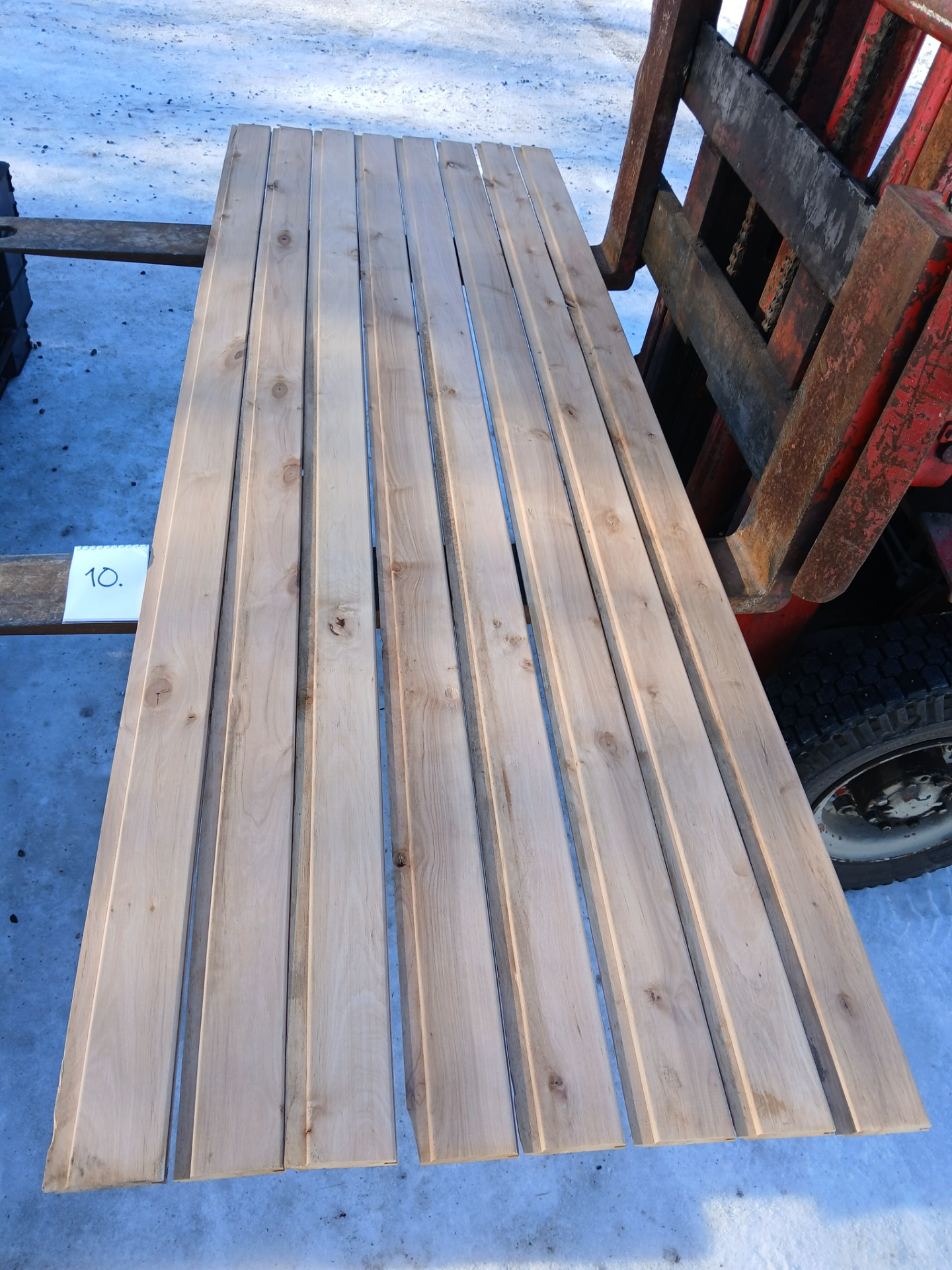 Alunperin ykköslaatua, mutta varastoitu pitkään. Paketit avattu ja laudat kuvattu 8.3.2026. Suurelta osin täysin ykköslaatuisen veroista, mutta kaikki myydään talouslaatuna. Kuvissa paneelien vasemmalla puolella trukkipiikillä paketin numero. Nopeimmat saavat valikoida haluamansa paketit kuvien perusteella.