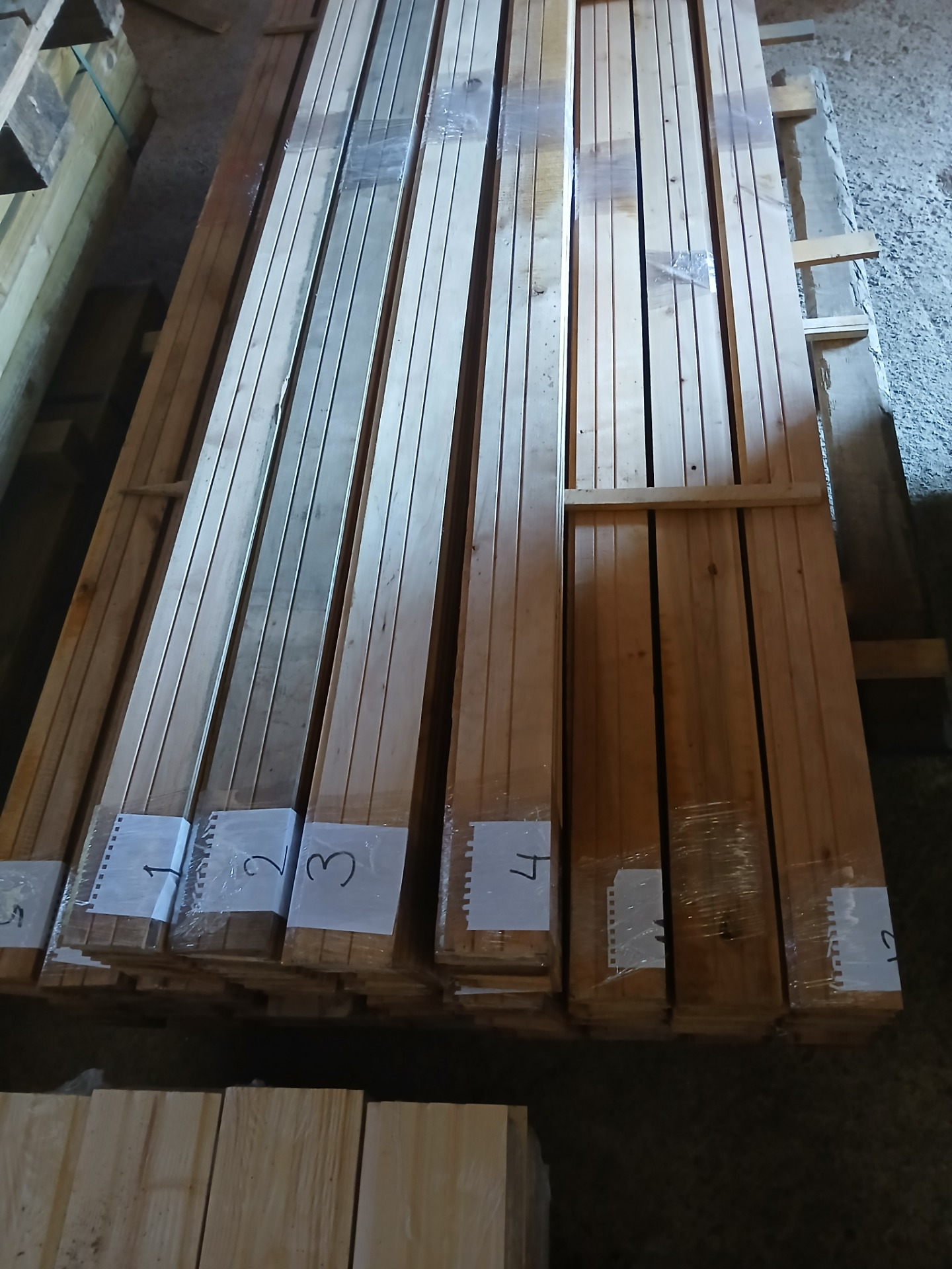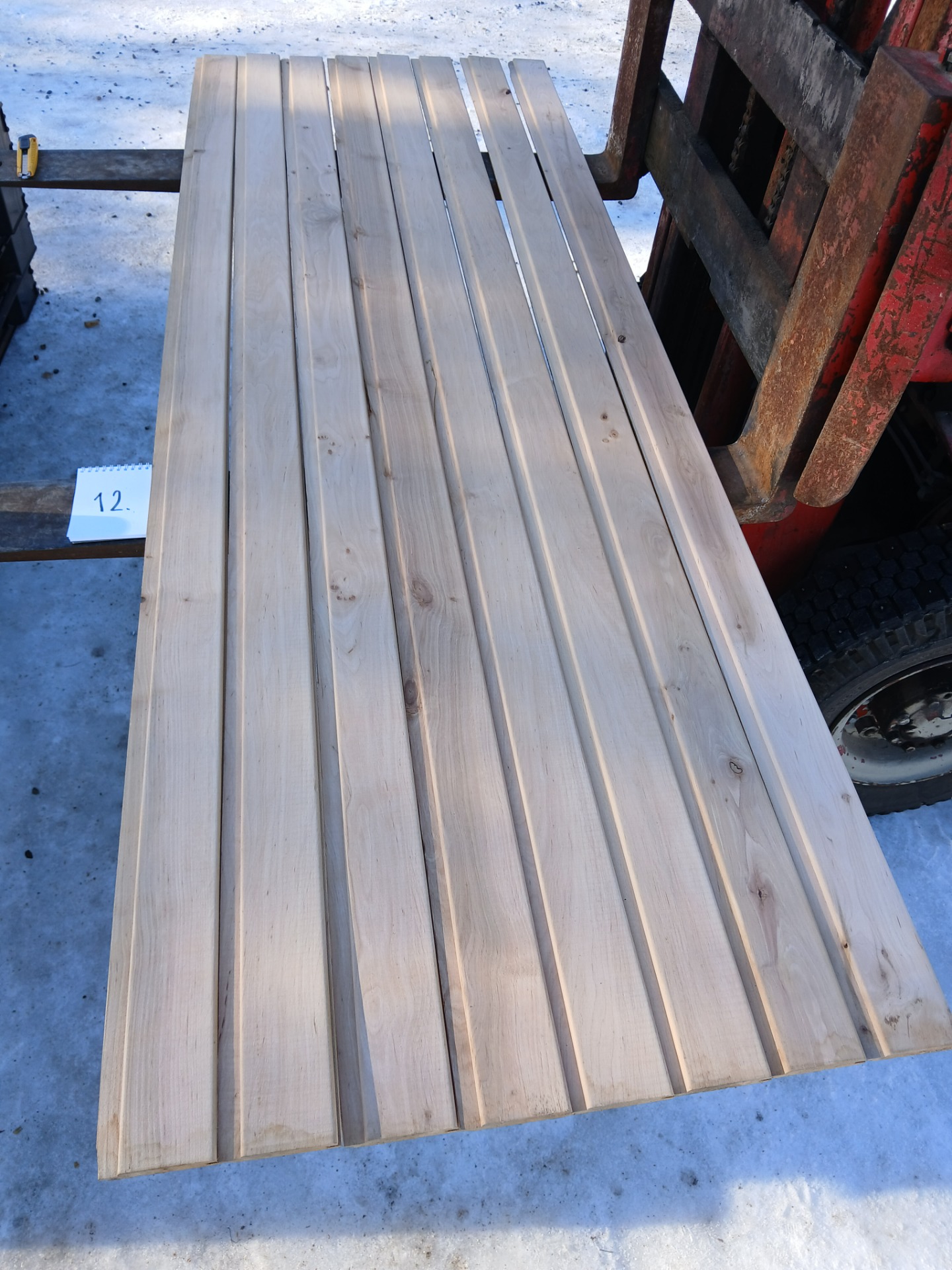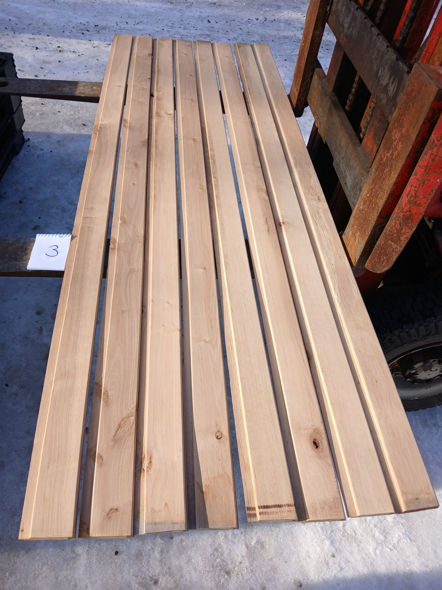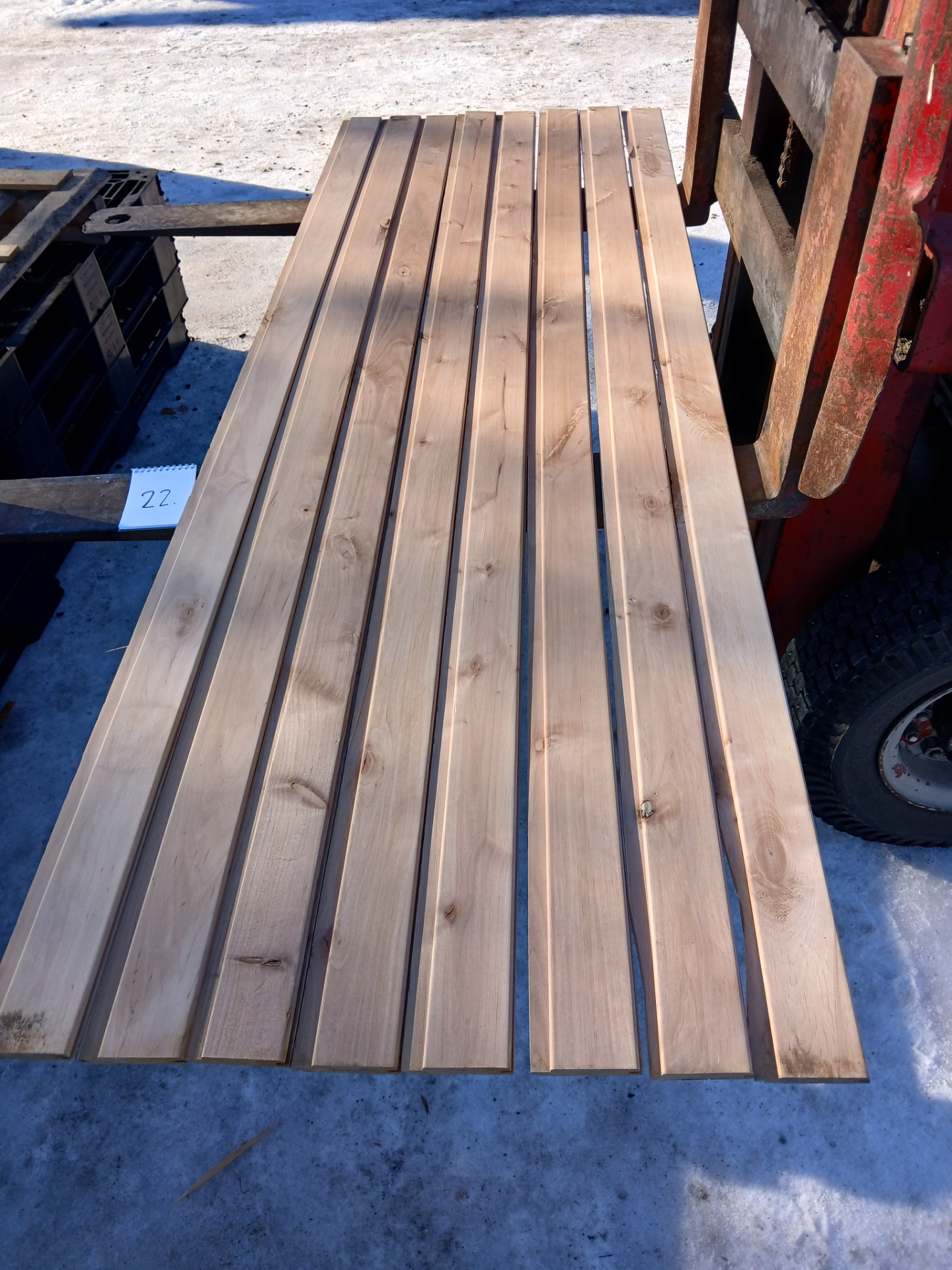 Alunperin ykköslaatua, mutta varastoitu pitkään. Paketit avattu ja laudat kuvattu 8.3.2026. Suurelta osin täysin ykköslaatuisen veroista, mutta kaikki myydään talouslaatuna. Kuvissa paneelien vasemmalla puolella trukkipiikillä paketin numero. Nopeimmat saavat valikoida haluamansa paketit kuvien perusteella.