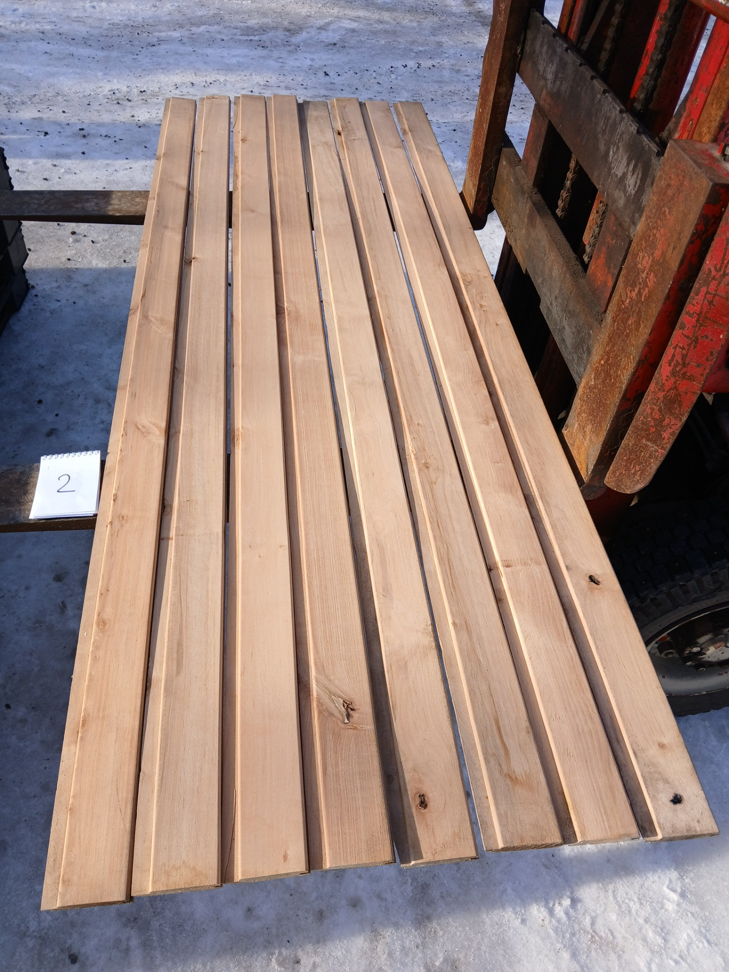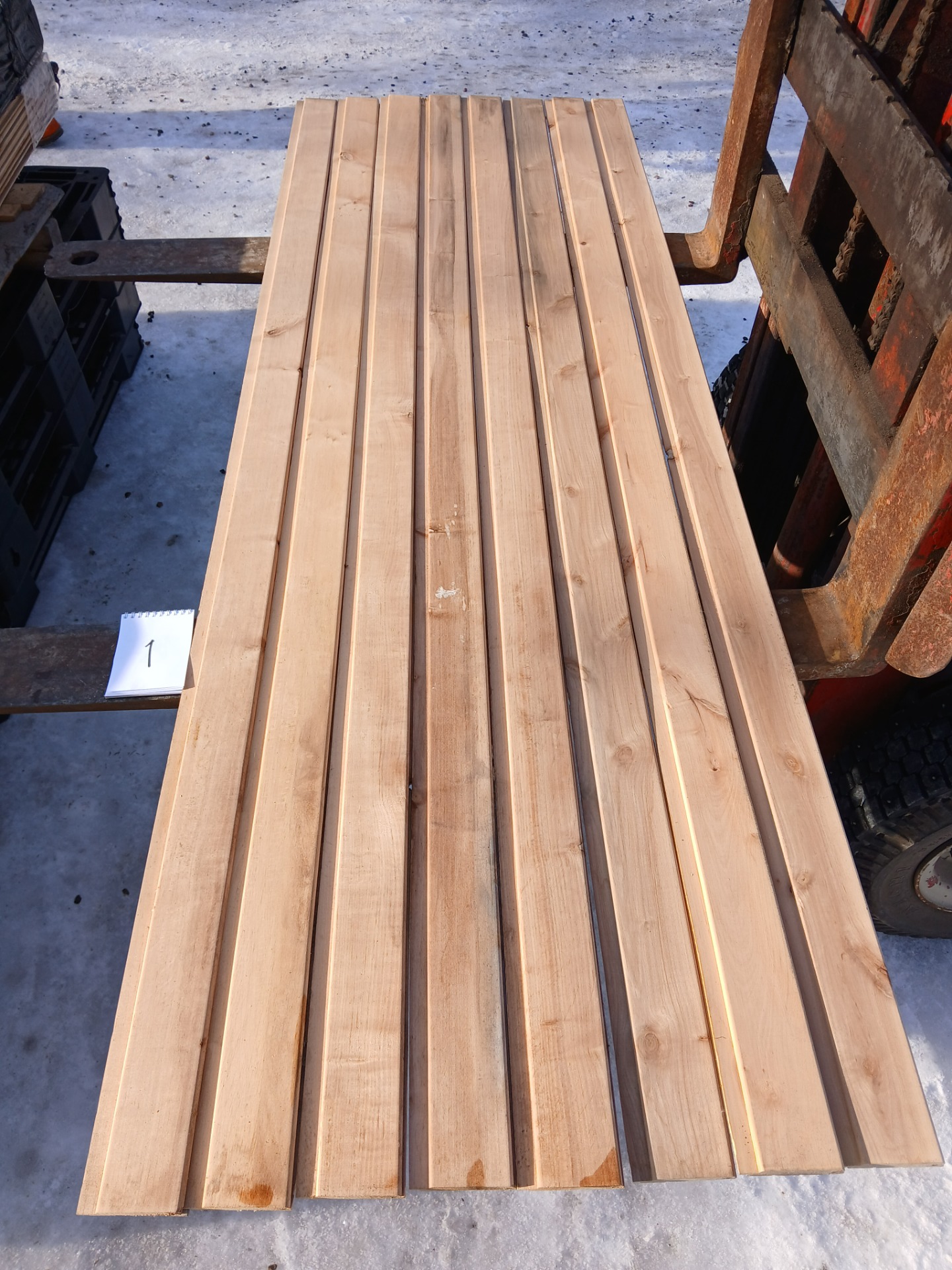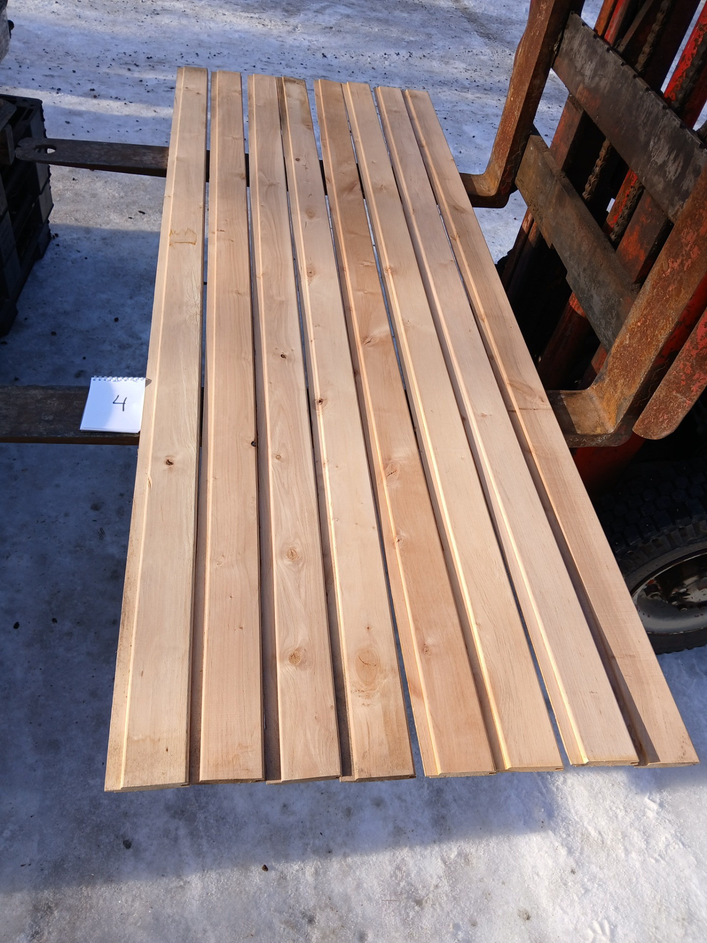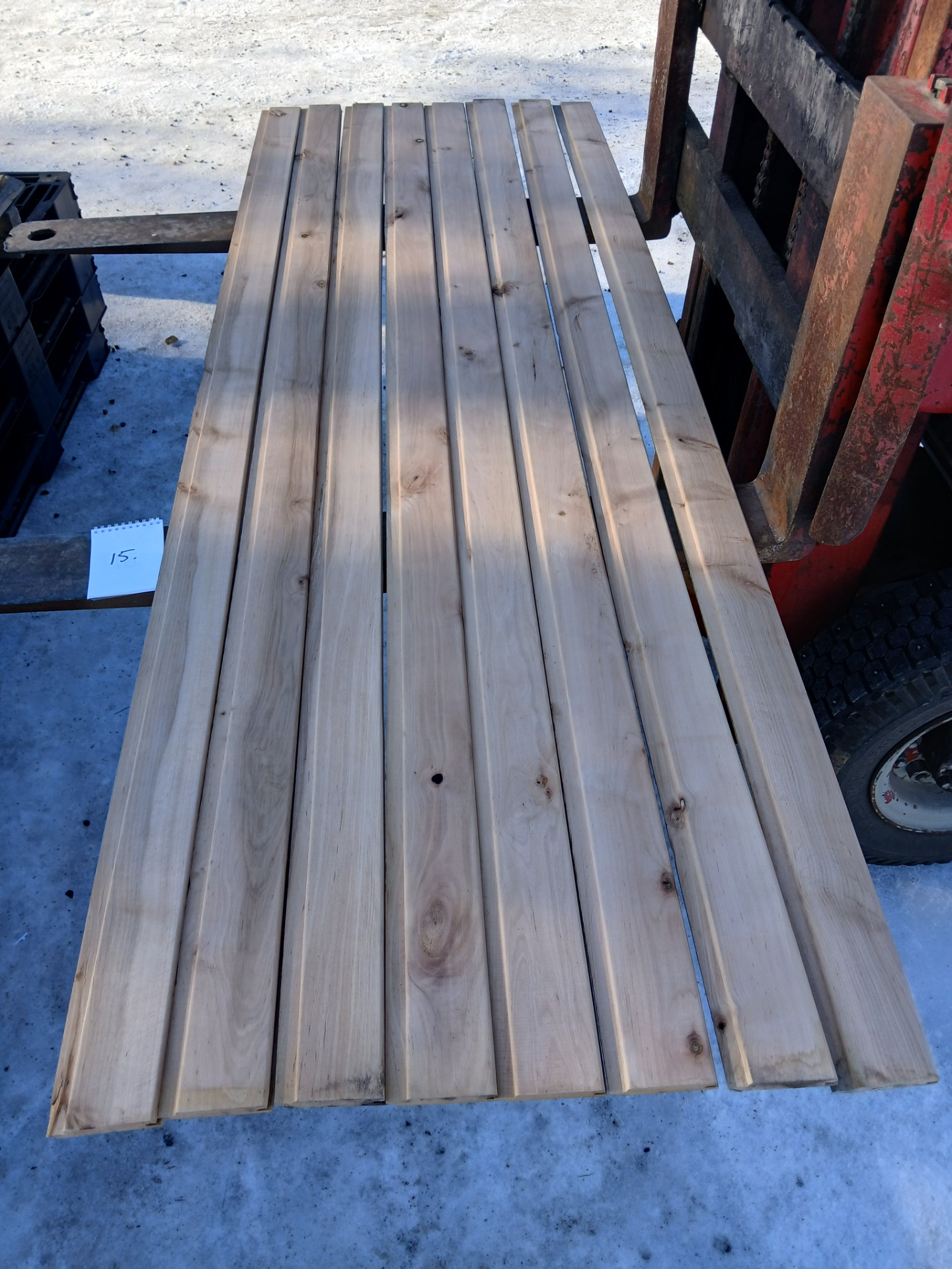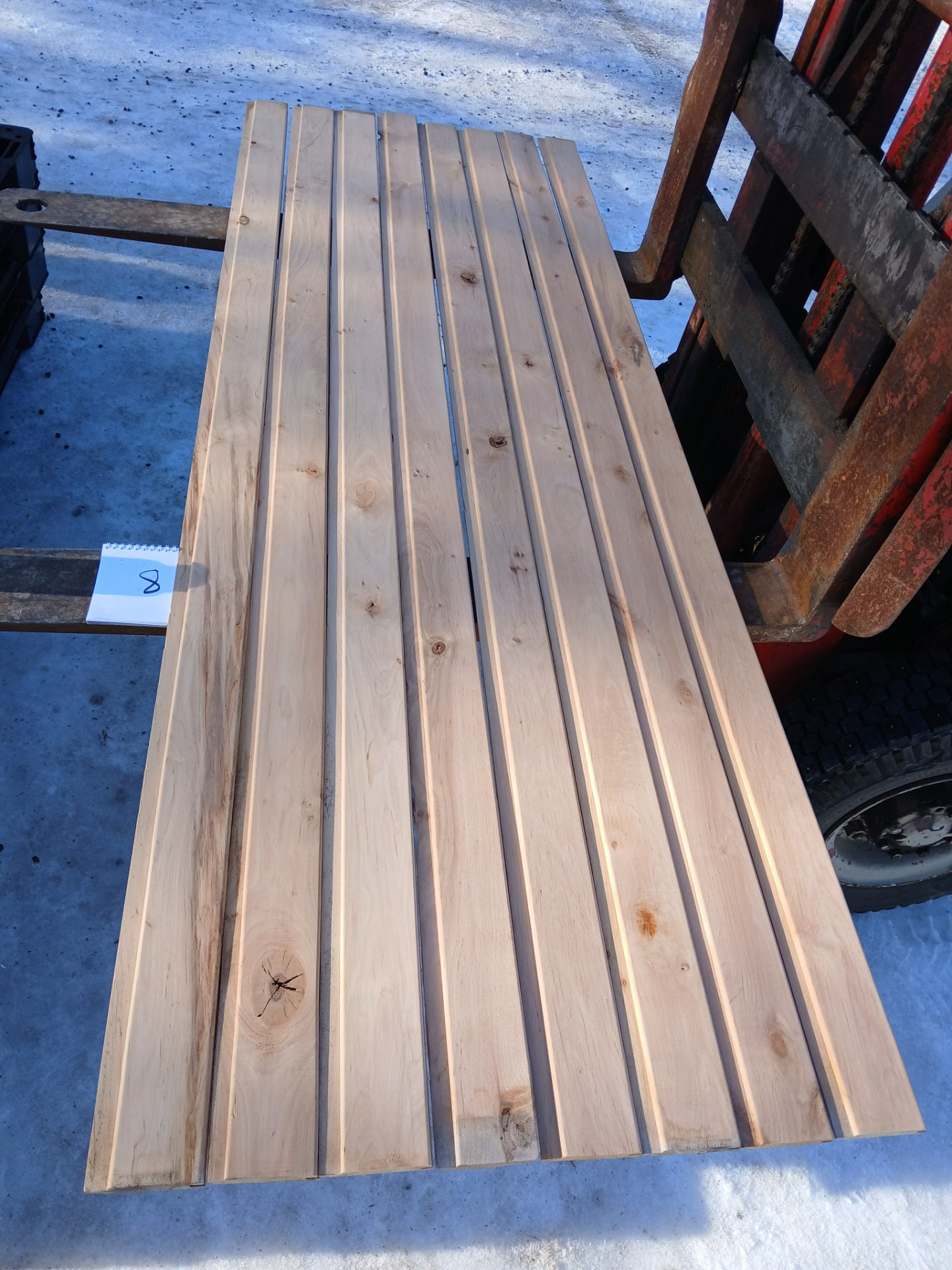 Alunperin ykköslaatua, mutta varastoitu pitkään. Paketit avattu ja laudat kuvattu 8.3.2026. Suurelta osin täysin ykköslaatuisen veroista, mutta kaikki myydään talouslaatuna. Kuvissa paneelien vasemmalla puolella trukkipiikillä paketin numero. Nopeimmat saavat valikoida haluamansa paketit kuvien perusteella.