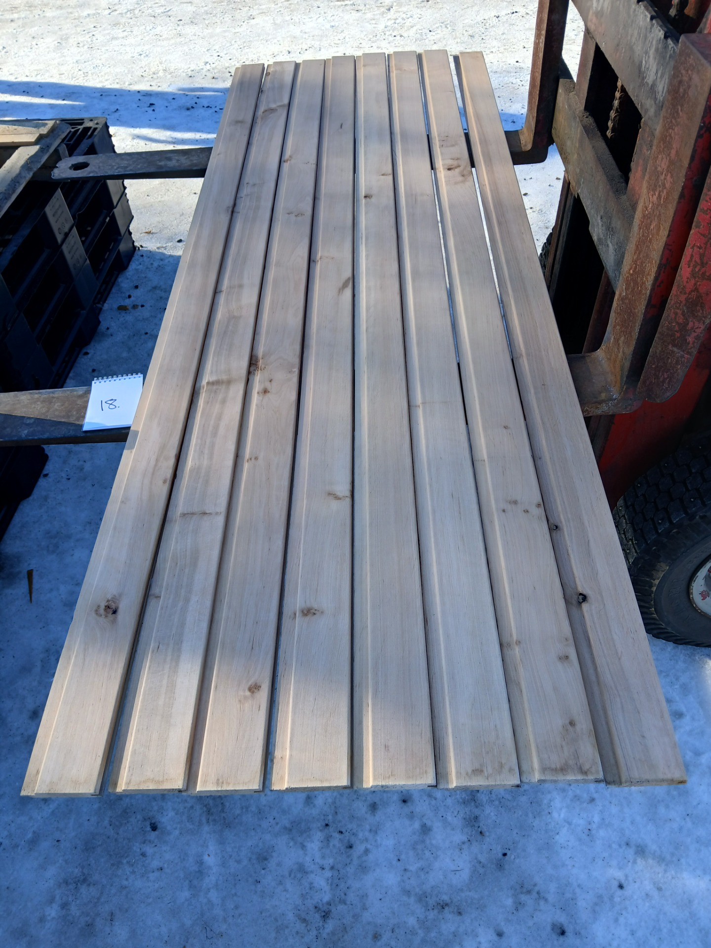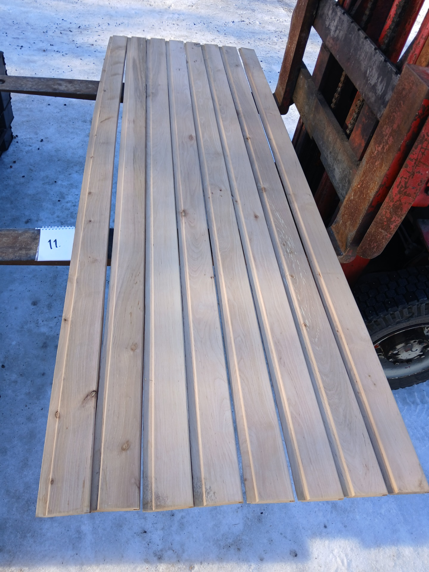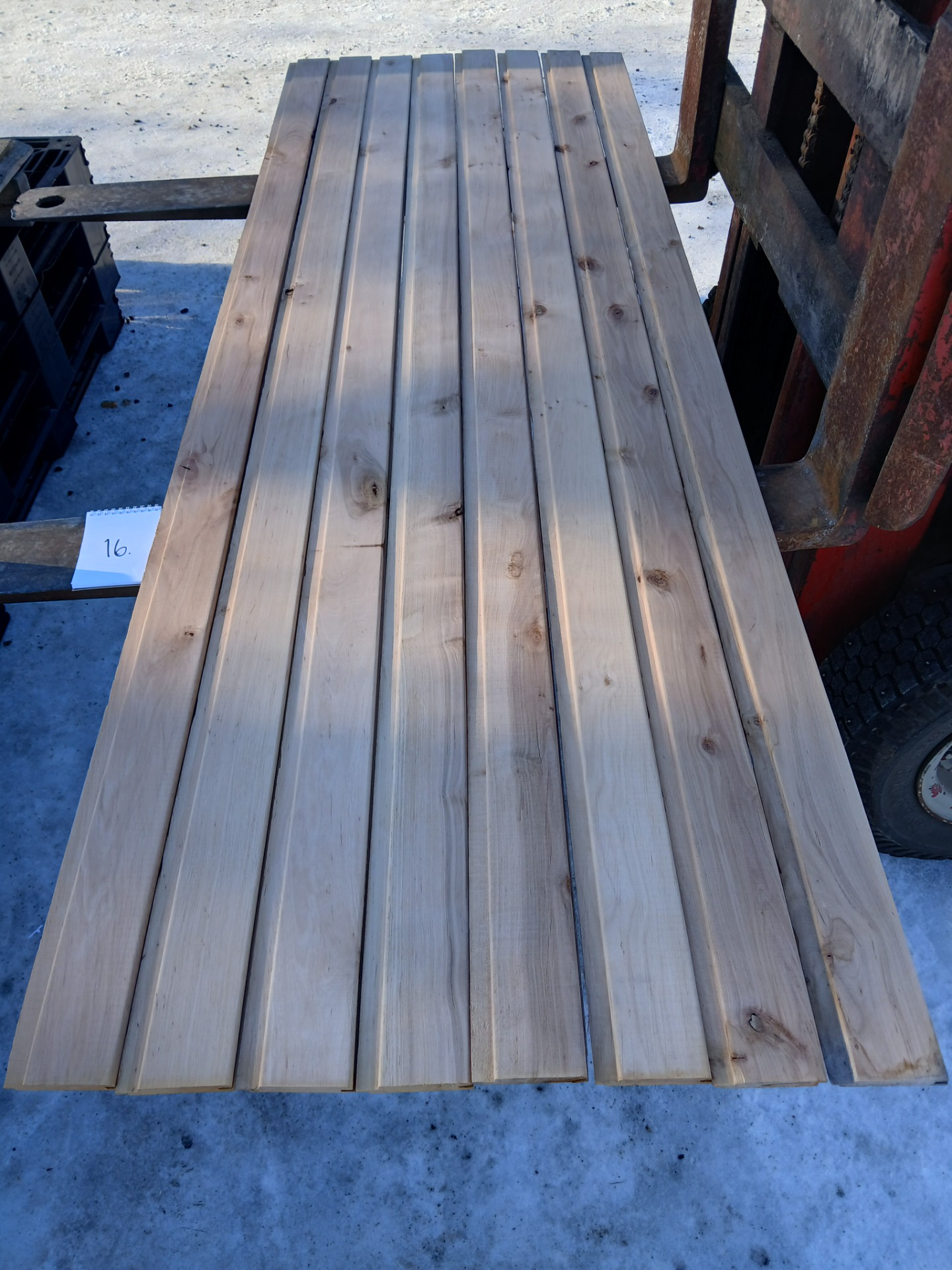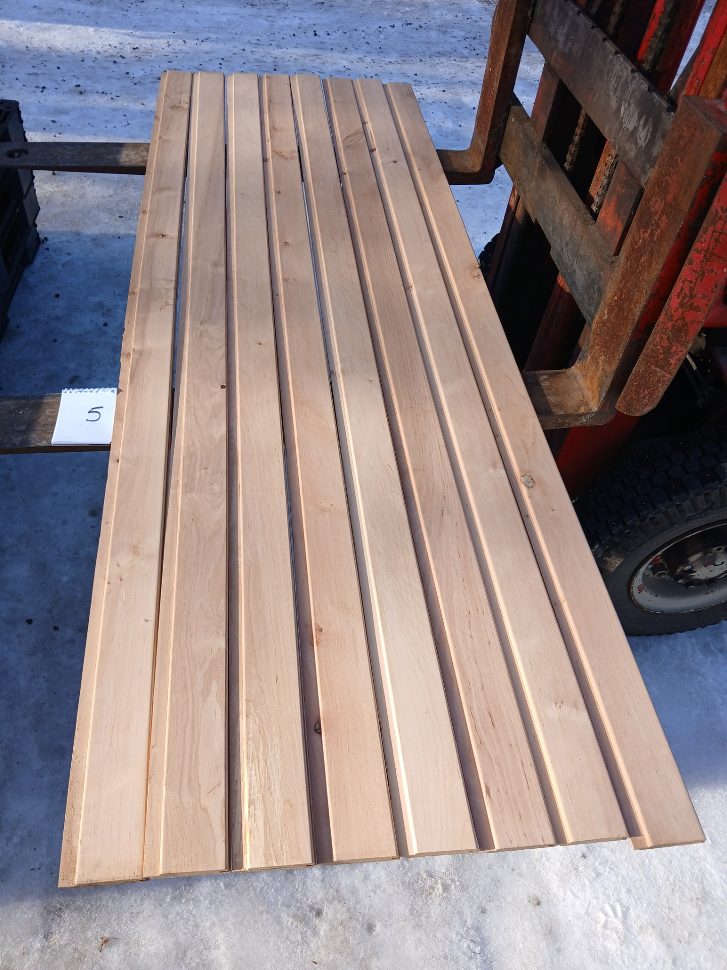 Alunperin ykköslaatua, mutta varastoitu pitkään. Paketit avattu ja laudat kuvattu 8.3.2026. Suurelta osin täysin ykköslaatuisen veroista, mutta kaikki myydään talouslaatuna. Kuvissa paneelien vasemmalla puolella trukkipiikillä paketin numero. Nopeimmat saavat valikoida haluamansa paketit kuvien perusteella.