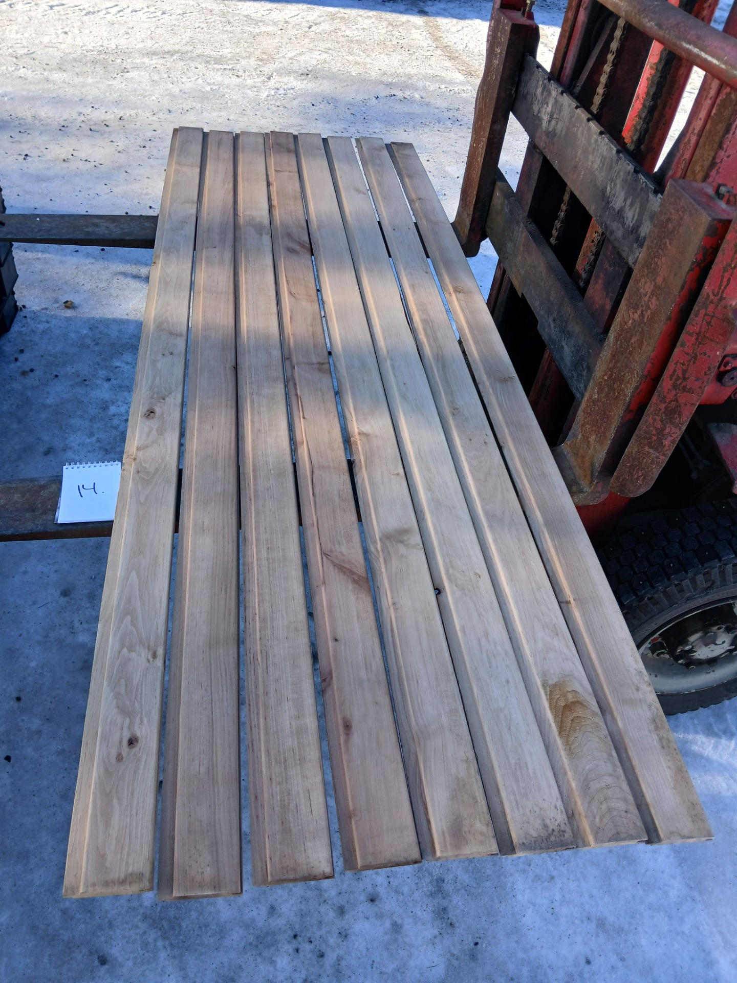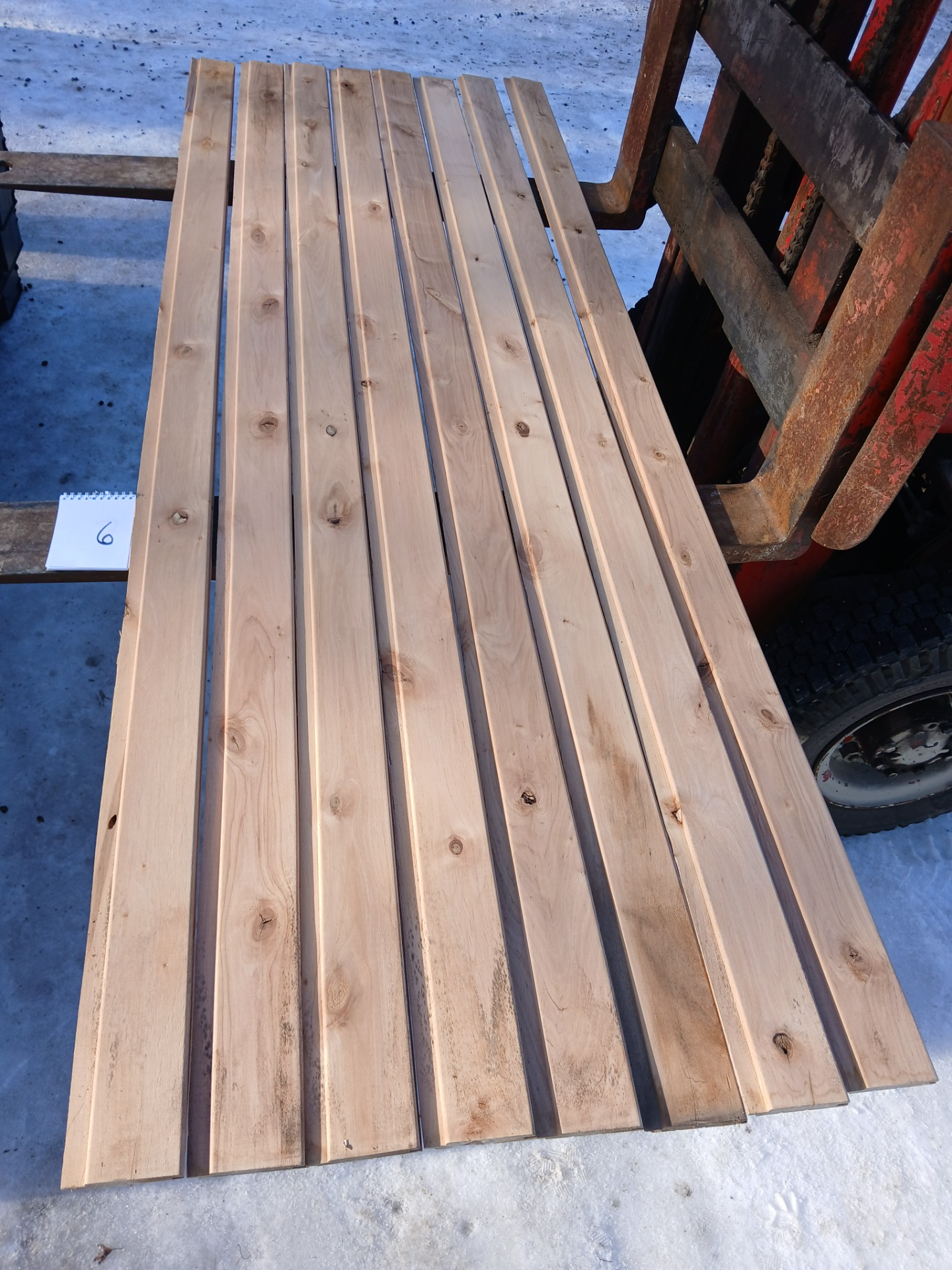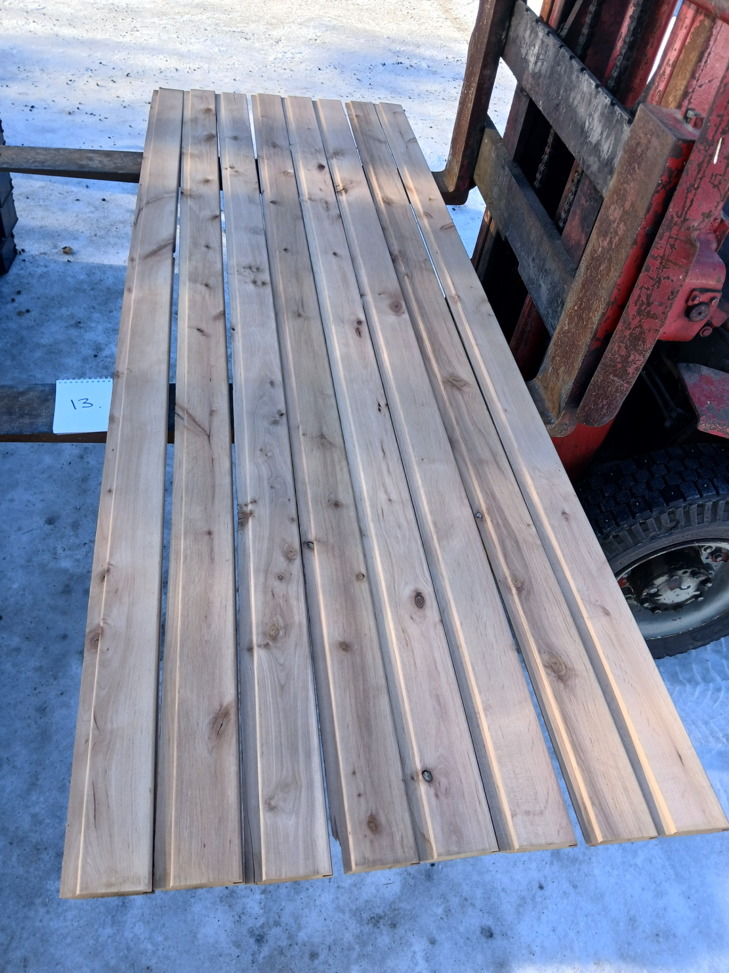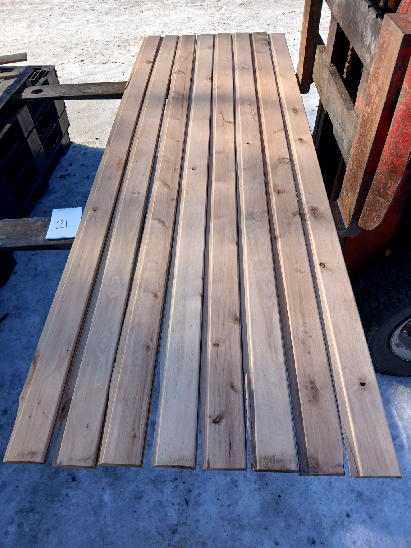 Alunperin ykköslaatua, mutta varastoitu pitkään. Paketit avattu ja laudat kuvattu 8.3.2026. Suurelta osin täysin ykköslaatuisen veroista, mutta kaikki myydään talouslaatuna. Kuvissa paneelien vasemmalla puolella trukkipiikillä paketin numero. Nopeimmat saavat valikoida haluamansa paketit kuvien perusteella.